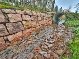 Kurzerhand wollte der Ortsbeirat das Problem im Rahmen eines Arbeitseinsatzes selber in die Hand nehmen – doch der #Amtsschimmel hat da gleich gewiehrt 🙂 So gingen zwei Jahre ins Land + einige Starkregen welche immer weiter an der Böschung nagten. Nach langer Zeit, als keiner mehr so recht dran glaubte, konnte im April 2022 endlich Vollzug gemeldet werden – die Bauchmauer wurde letztendlich durch eine Firma gebaut und sichert jetzt die Böschung. Wir sagen danke 🙂