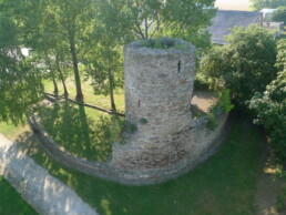 Einst umgab die Burg ein Wassergraben und ein Teich, die bis auf einen geringen Rest ca. 1840 in Wiese umgewandelt wurden. In der Nähe befand sich eine Ölmühle bzw. Ölstampfe. Das genaue Datum ihres Verschwindens ist unbekannt. Die Ruine war bis 1869 wesentlich größer, jedoch befand sie sich in einem leidlichen Zustand. In diesem Jahr brannte das benachbarte Vorwerk ab (Infotafel Nr. 23). Beim Wiederaufbau nutzte man ohne Rücksicht große Teile der Ruine als Baumaterial. Dem weiteren Verfall des Turmes wurde später Einhalt geboten, indem erfreulicherweise der Vorwerksbesitzer Wolf, der einen Teil des Vorwerks seit 1888 besaß, den Turm wieder ein Stück aufbauen und das Mauerwerk ausbessern ließ.